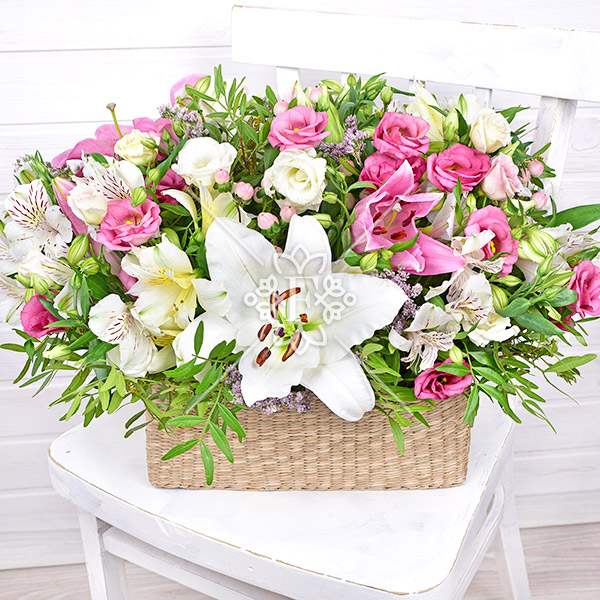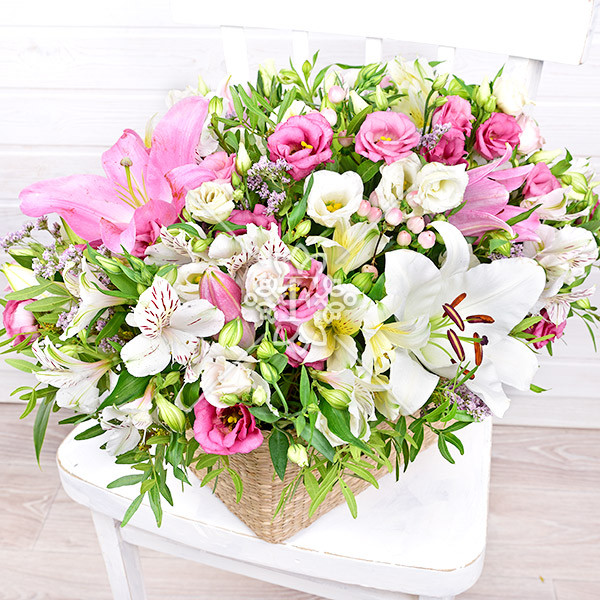 лилия белая и розовая – 2 шт., эустома розовая – 12 шт., эустома белая – 9 шт., гиперикум розовый – 4шт., альстромерия белая – 6 шт., зелень декоративная (фисташка, лимониум фиолетовый), оазис, корзинка.